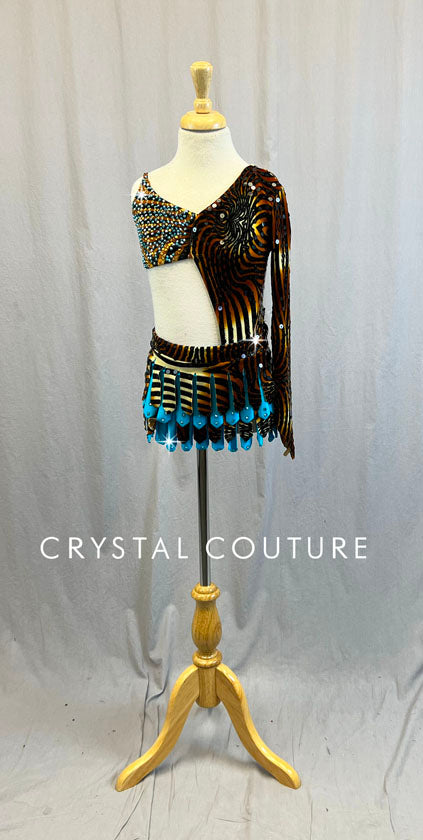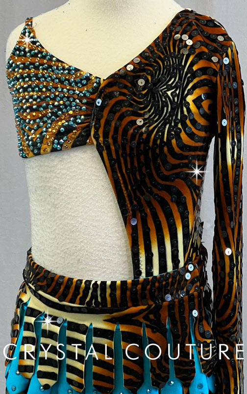 * Brown & Black custom made animal print asymmetrical bra-top and attached layered pleated skirt. Bra top is decorated with Swarovski Blue Zircon AB and Topaz rhinestones while the long sleeve print has Black sequins. Skirt is layered with strips of sequined animal print and Blue lycra with attached panty.