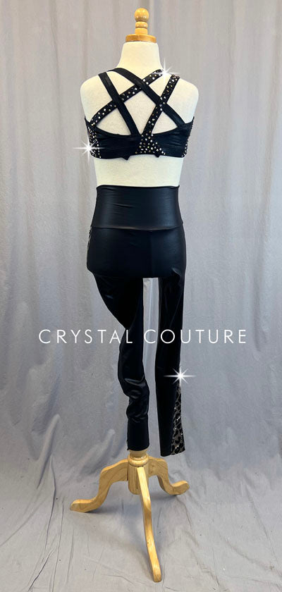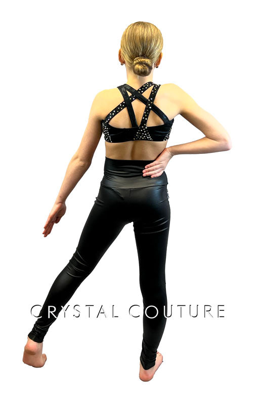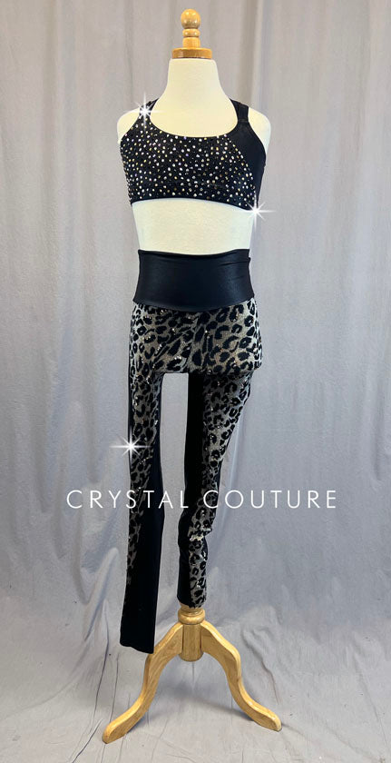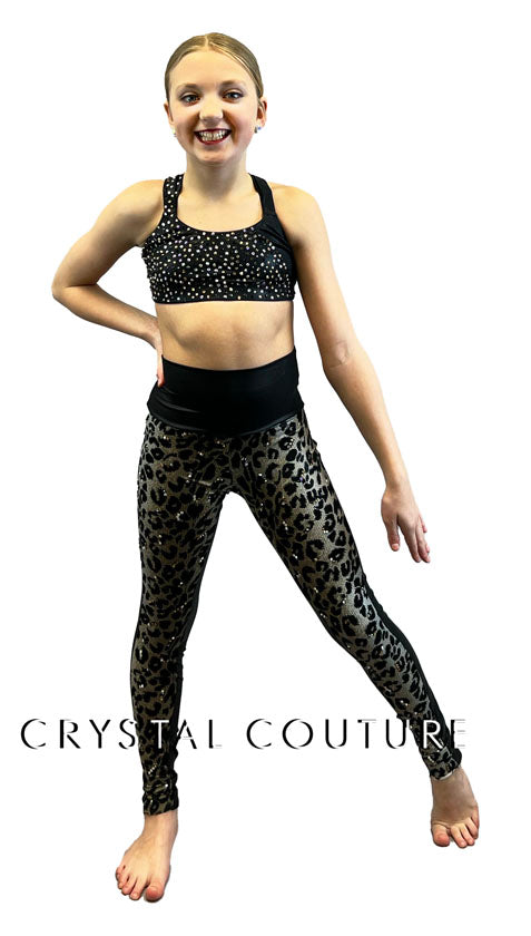Black strappy back lycra top is heavily rhinestoned. Paired with high waisted Black and Animal Print pleather leggings.