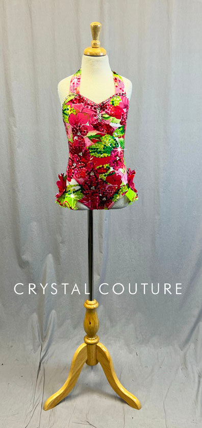 SUPER CUTE Pink and Green floral swimsuit inspired halter leotard. The fabric is a floral patterned lycra covered with matching Lime Green, Hot Pink, Red and Green zodiac sequin plus Crystal rhinestones!. Bright Green sheer mesh ruffles and flowers accent the hips. This costume is the simply adorable cutest! Highly detailed!