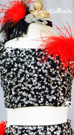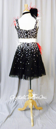 * Black 2 piece satin crop top with zipper back closure and Black satin and tulle layered skirt. Costume is covered in Black sheer mesh with sewn on Crystal and Jet acrylic shapes (rivoli, pear, navette), sequins and beading. Costume is accented with Red feathers. Costume does not come with trunks.