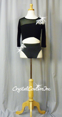 Black 2 Piece Crop Top and Trunks with White Embroidered Appliques