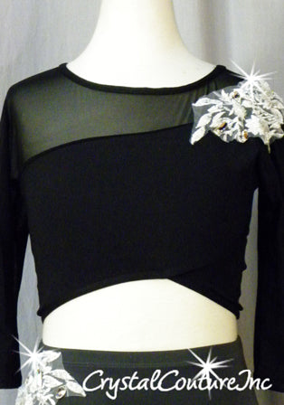 Black lycra 3/4 sleeve crop top and Charcoal Gray briefs. Costume is accented with White embroidered/beaded/pearl appliques and Swarovski sew-on baguette and Swarovski sew-on navette shapes!