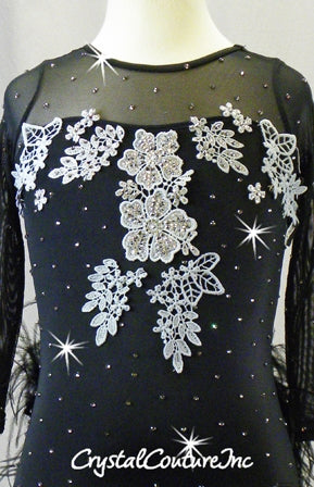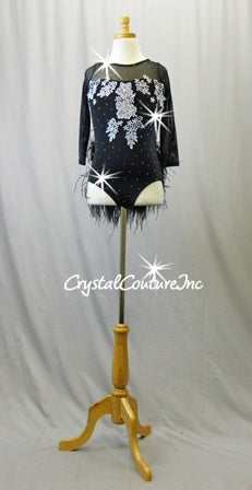 Black 3/4 Sleeve Leotard with Feather Bustle Skirt - Swarovski Rhinestones