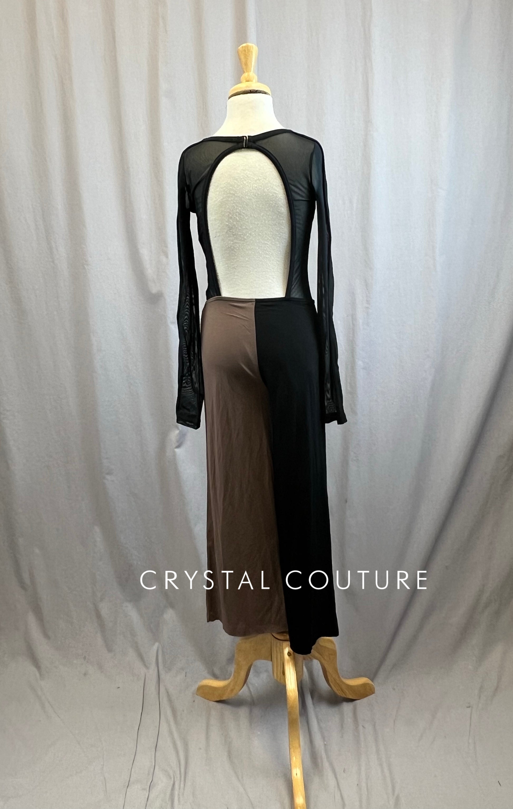 Black and brown unitard with black mesh inserts, open back, and wide leg pants.
