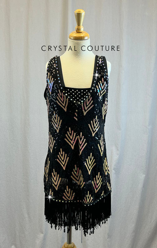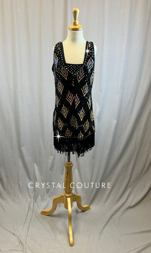 Black leotard with black and light pink shimmer sequin flapper mesh overlay dress with black fringe and sequin at very bottom of dress. Black leotard accessorized with about 3 dozen Jet Hematite rhinestones in center of leotard in a V shape both front and back. Flapper overlay dress has about 2 dozen Crystal AB rhinestones along neckline and straps.