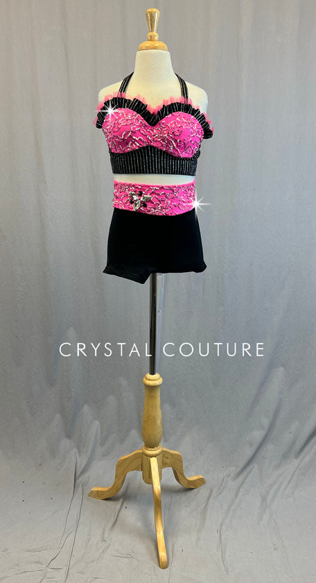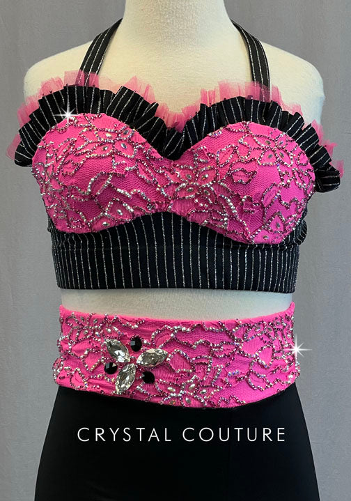 Halter bustier crop top is Hot Pink lace and Black and Silver pinstripe. Ruffle lining on sweetheart neckline. Black lycra booty shorts have Hot Pink high waist band covered with lace. 10.5 Gross of Crystal AB 9ss, 12ss, and Navetttes Crystal and Jet Large Shapes, Rose 9ss, 12ss, and 16ss, and Fuschia 9ss, 12ss, and 16ss Rhinestones!