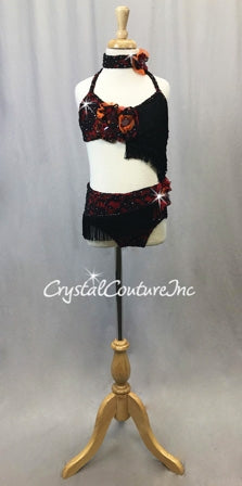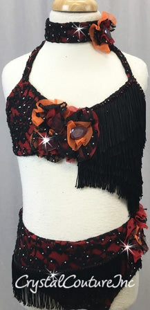 Sassy custom made Black floral lace with Red lycra base connected 2 piece halter top and trunk. Top is decorated with Orange mesh, Red mesh and Black lace 3D flowers with Swarovski large fancy stone! Black Chainette fringe tiers connect to the trunk, creating a draped front skirt and back lace skirt panel. Swarovski rhinestone accent the Black lace and fringe.