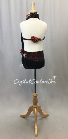 Black and Red Connected 2 pc Halter Top and Brief/Back Skirt- Swarovski Rhinestones