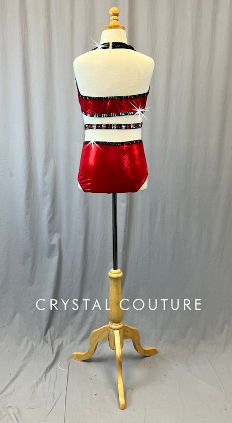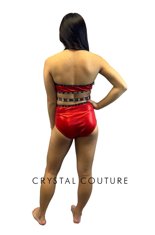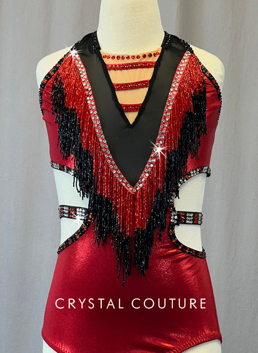 Custom Black & Red Leotard with Side Cutouts & Beaded Fringe - Rhinestones