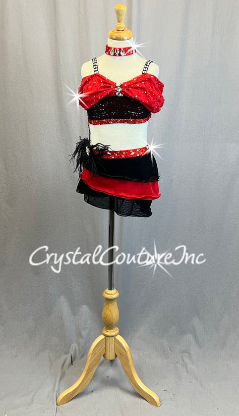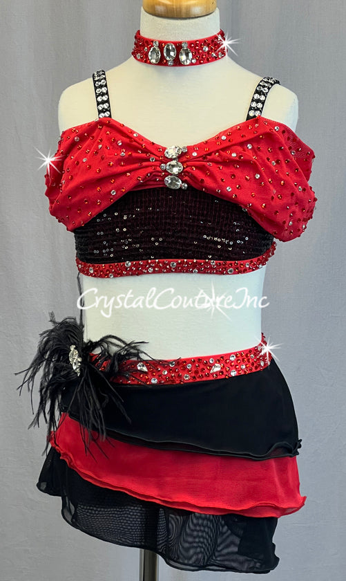 Custom Black & Red Off Shoulder Top with Tiered Ruffle Skirt - Rhinestones