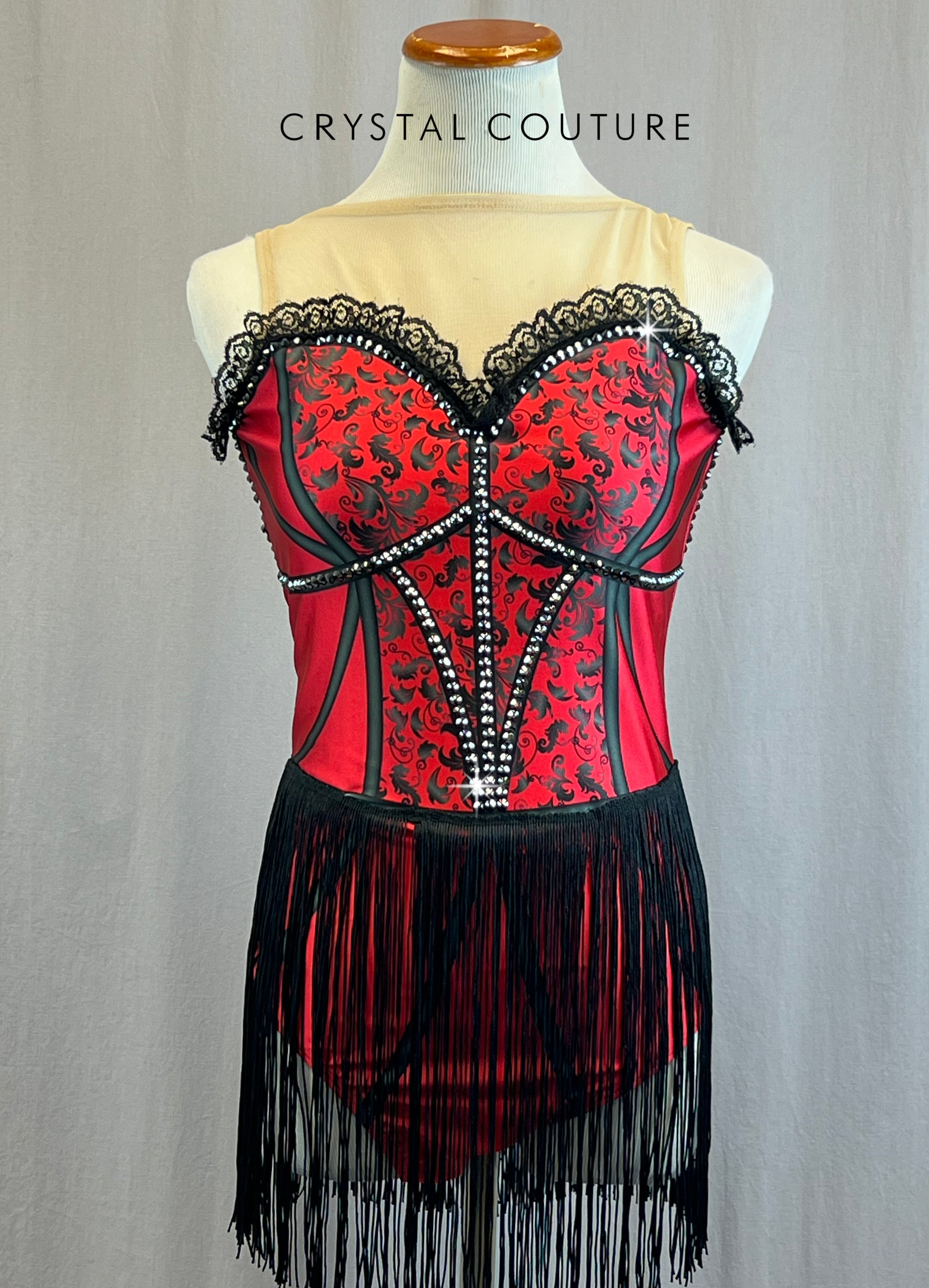 Black and Red screen printed leotard with bustier effect features a Nude mesh tank style top and scoop back for a backless look. Sweetheart bust line is trimmed with Black lace and accented with Jet Hematite rhinestones in size 30ss. Over a gross of rhinestones continue to trim Black printed boning. Black seven inch fringe skirt adds the perfect finishing touch!