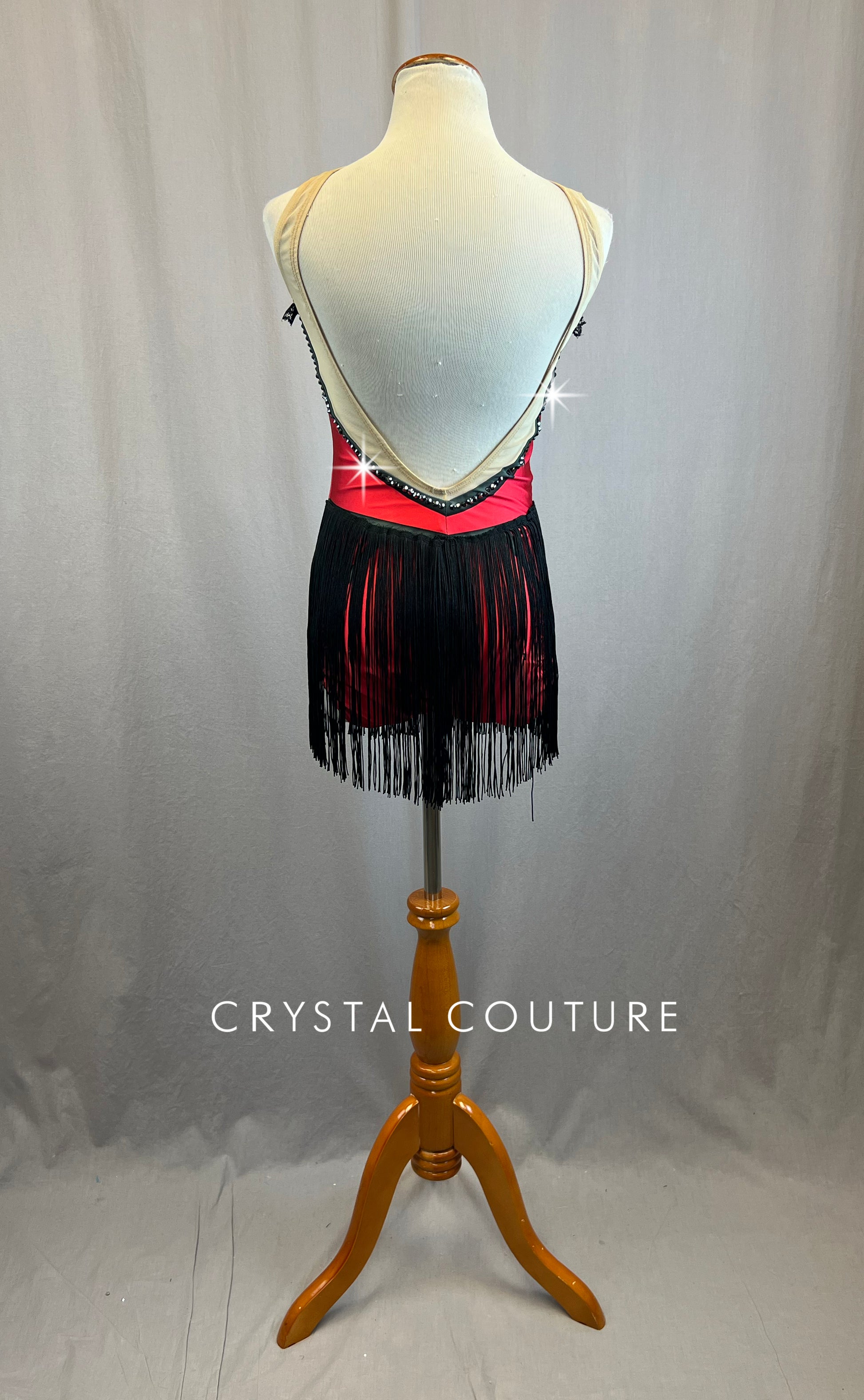 Black and Red Screen Printed Lycra Backless Leotard with Rhinestones and Fringe
