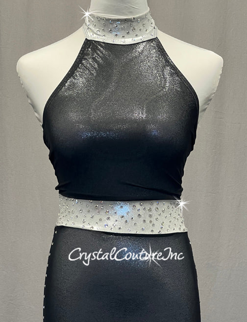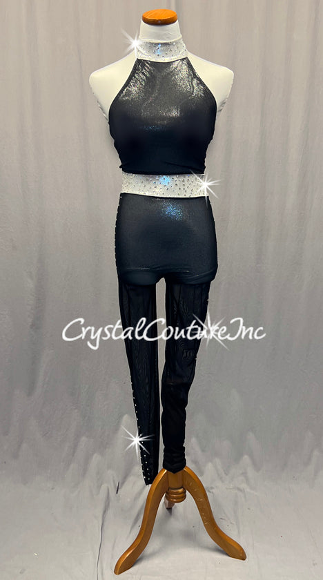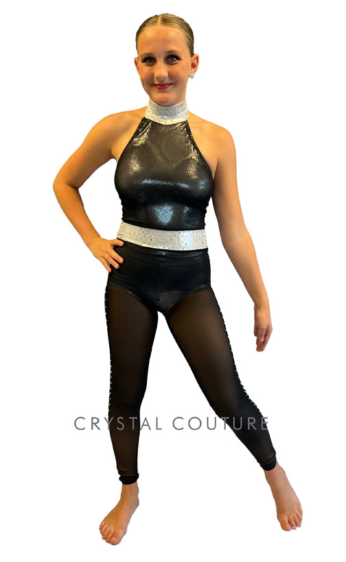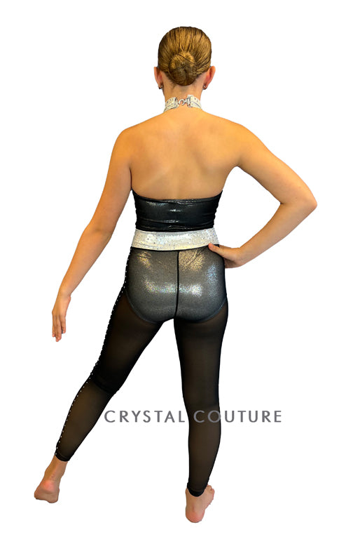 Black and Silver Halter Unitard with Mesh - Rhinestones