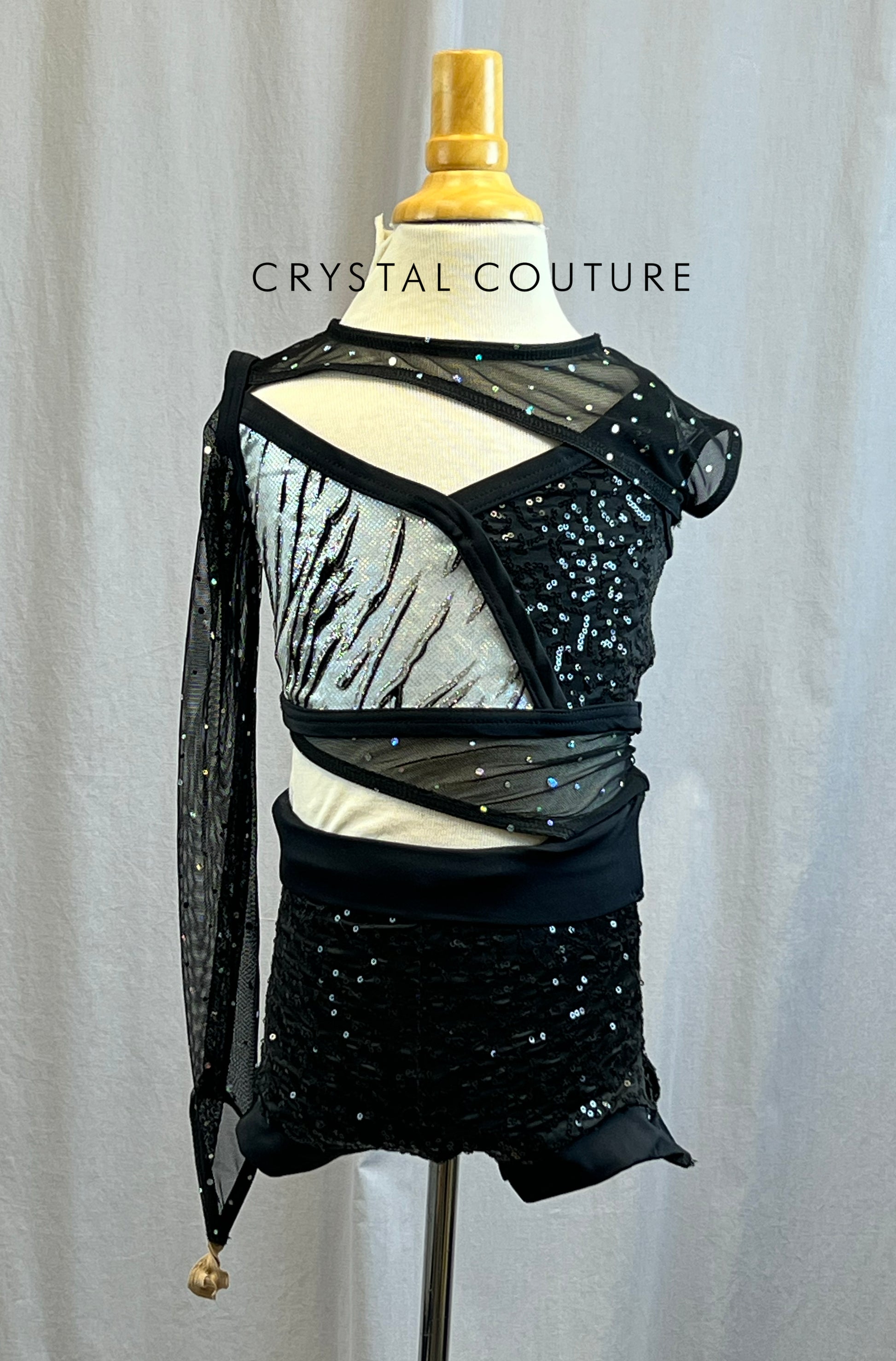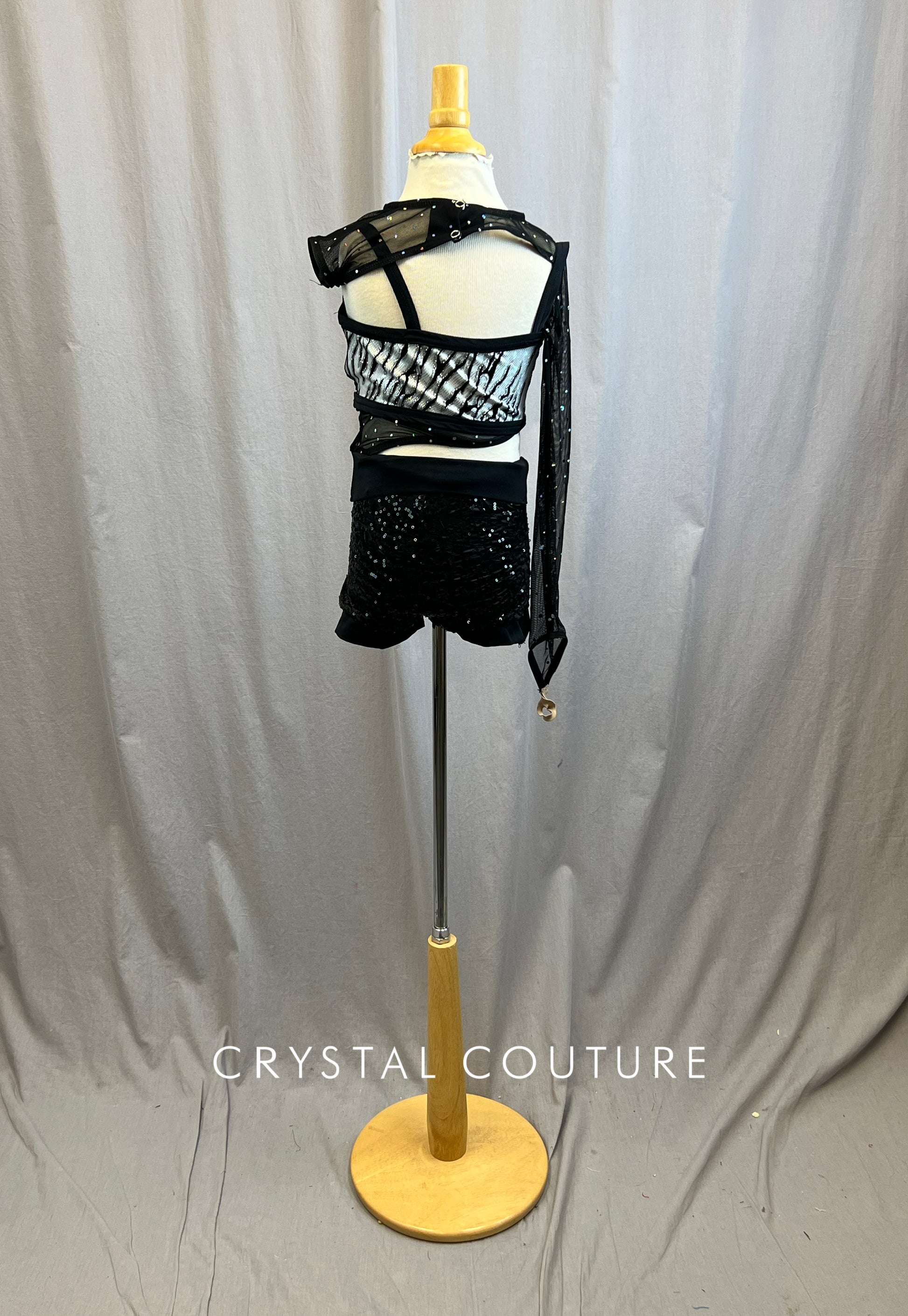 So sassy! Base of biketard is double lined black zsa zsa and mesh with cut outs. Right side of chest is a black and silver zebra design. Left sleeve is a short cap black mesh sleeve while the right is a long sleeve with finger loop. Mesh throughout the costume is accessorized with AB sequins.