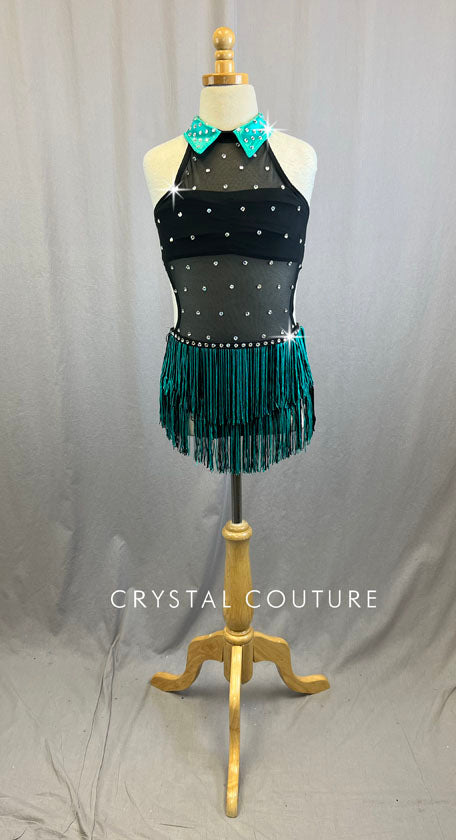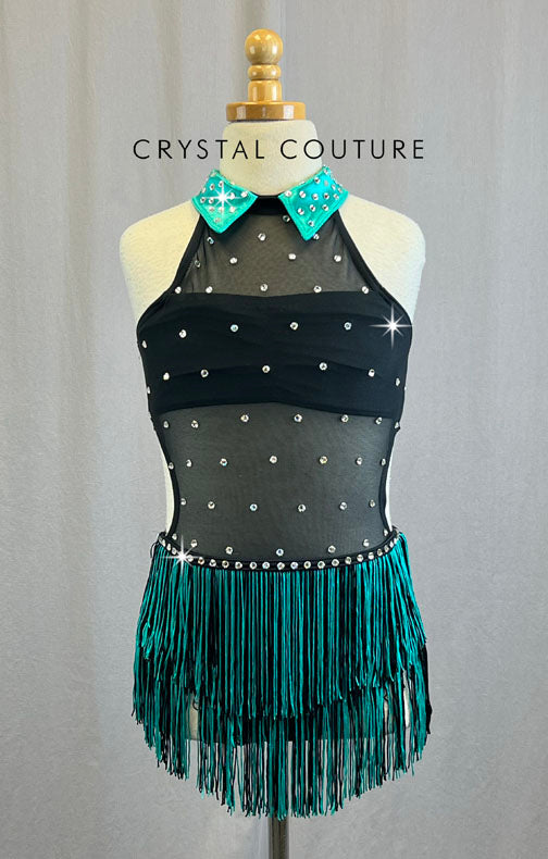 Black and Teal Collared Fringe Dress with Mesh Cutouts - Rhinestones
