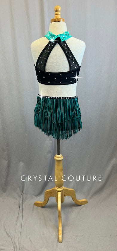 Black and teal mesh cutout leotard with layered black and teal fringe skirt. Teal collar accents the mesh bodice with black lycra bra underneath. Leotard has open low back. Accented with 1 gross of Crystal rhinestones.