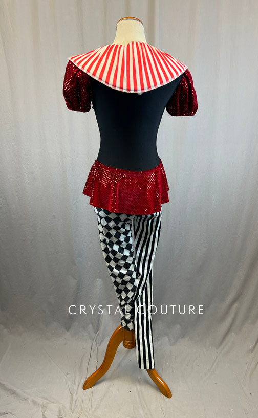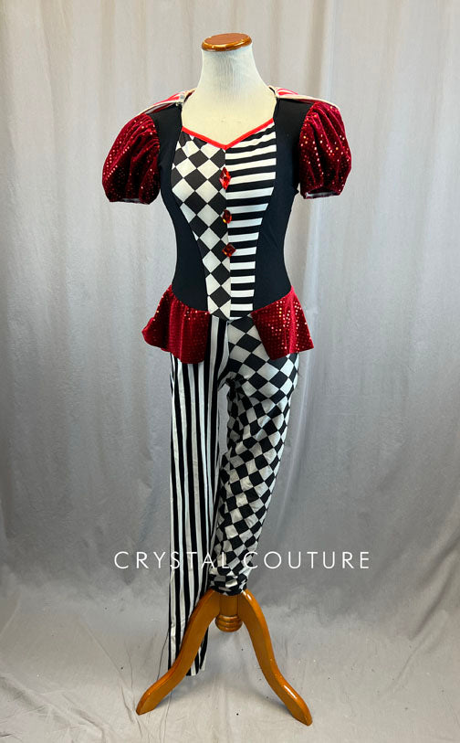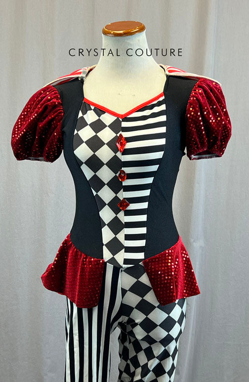 Black and white checkered and striped unitard with red sequined puff sleeves and half skirt. Red and white neck piece and red fancy stone accents on bodice.