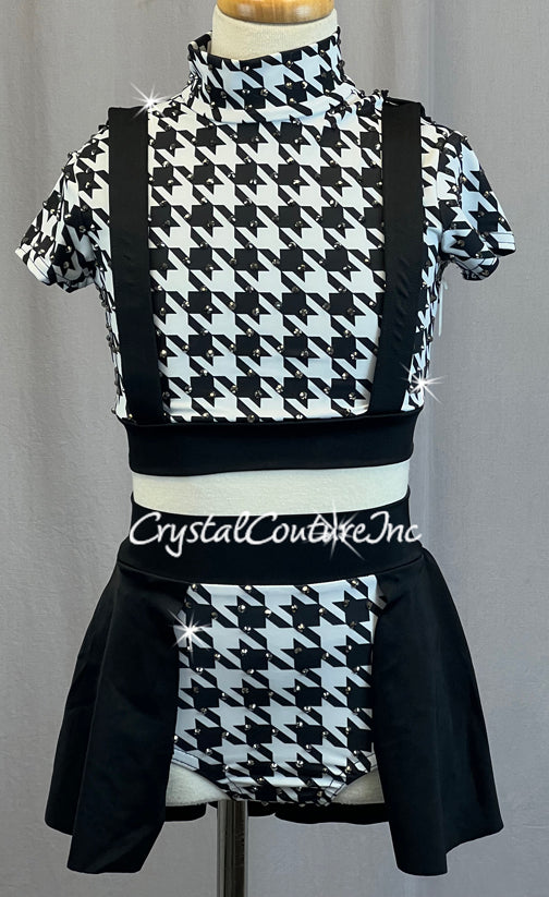 Black and White Houndstooth Crop and Trunk with Attached Half Skirt - Rhinestones