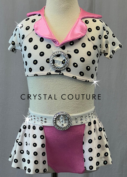 White short sleeved bra top has Black polka dots, a shimmering Pink collar, and a Silver rhinestoned hoop on the front. Trunks are Pink with White waistband and attached polka dot half skirt with hoop on center front of waistband.