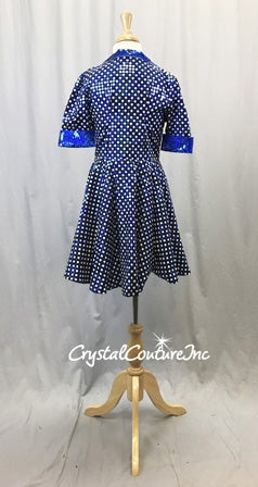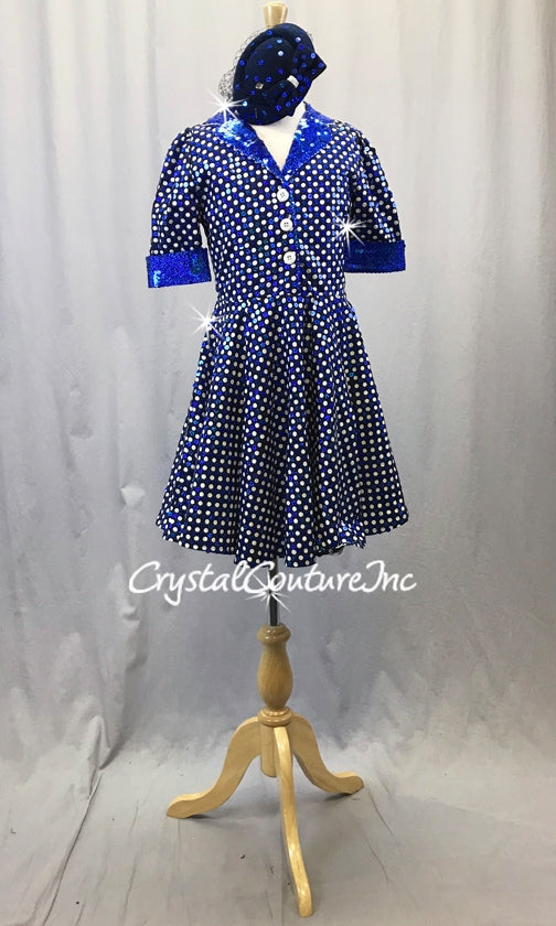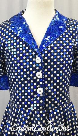 Adorable Fifty's inspired Black and White Polka dot dress, with TONS of Royal Blue zodiac sequins covering the collar, cuffs and between each of the polka dots! Separate Royal Blue trunk. Lots of detail!
