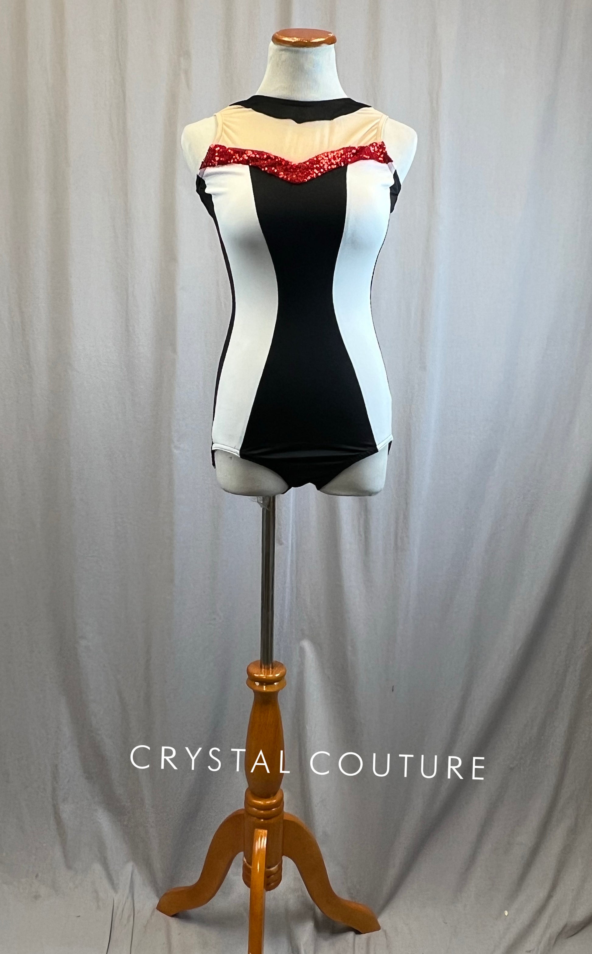 Double lined black and white stripe lycra leotard. Across the chest is nude colored mesh and red sequin mesh for added coverage. Nude mesh wraps around to the upper back as well.