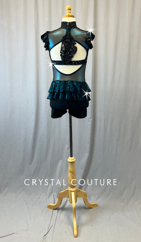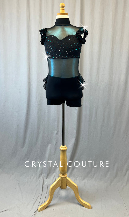 Black mock neck biketard with Blue shimmer mesh around bodice, on back, and upper chest. Keyhole opening in back with wide horizontal strap across back and black fleur applique connecting back strap to back of neck. Two tiered ruffle on low back and single ruffle on each shoulder. Rhinestones throughout ruffles and on bandeau style lycra top.