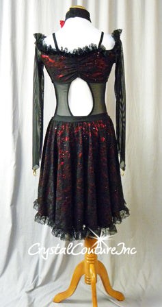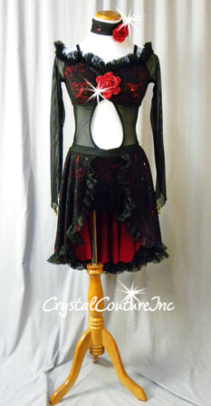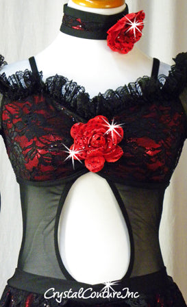 Spanish inspired Black floral lace connected 2 piece with shimmery Red lycra lining, Black sheer mesh midriff and Black lace half skirt. . Off-the shoulder top is is accented with lace ruffles, Red flower and Swarovski rhinestones.
