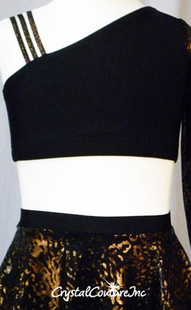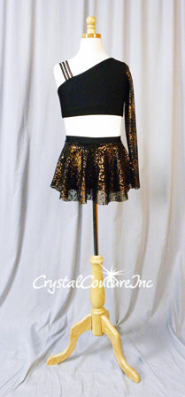 Seamstress Sample - BRAND NEW - Black lycra crop top and booty shorts with Black sheer mesh with Gold/Bronze animal print circle skirt. Asymmetrical top has Bronze elastic straps and animal print Black/Gold sheer mesh long sleeve.