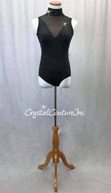 Black high neck leotard with Black mesh v-front and back both lined with Nude, back zipper. Paired with separate Black/Brown/Tan animal print jacket. Costume is decorated with Swarovski Rhinestones!