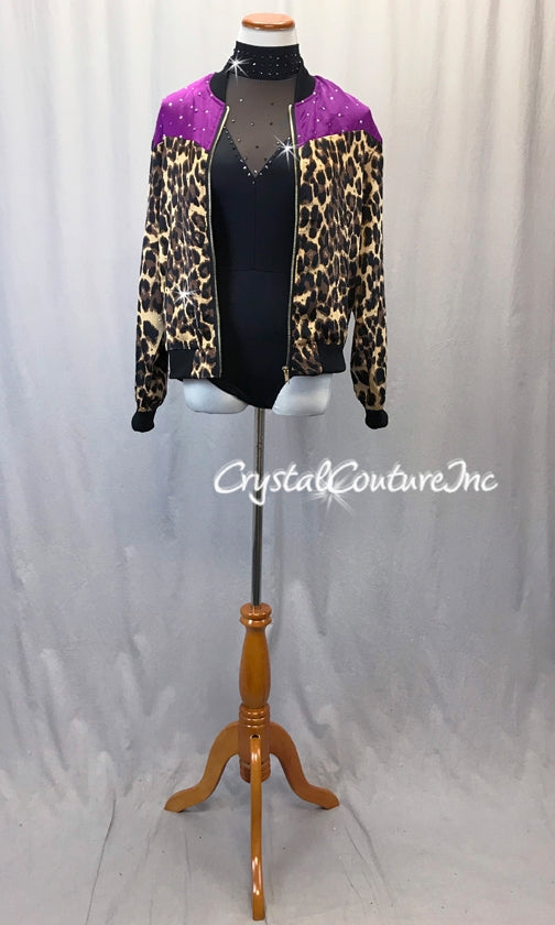 Black High Neck Lycra & Mesh Leotard with Animal Print Jacket - Swarovski Rhinestones