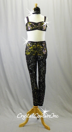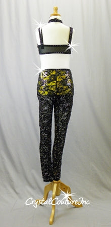 Black Lace and Yellow Lycra Top & Trunks with Lace Leggings - Swarovski Rhinestones