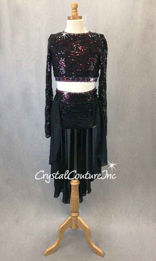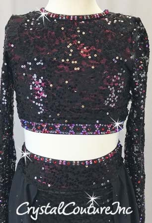 Black sequin lace long sleeve top over shimmery Burgundy lycra. Paired with Black zsa zsa sequin trunks, Black/Shimmery Burgundy waistband and long Black chiffon 3/4 skirt. Rhinestone patterns enhance the neckline, waistband and sleeves!