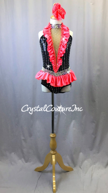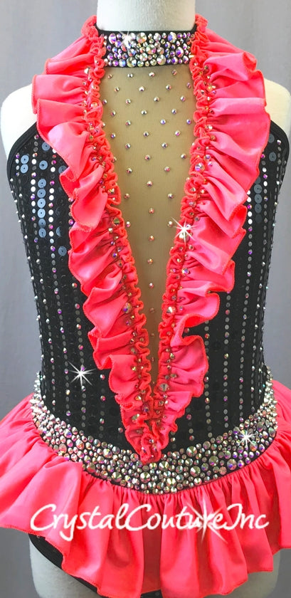 Sassy Black leotard with bright coral ruffle accents. Mock-neck leotard has Nude front mesh inset and open back. Costume is decorated with alternating rows of Black metallic sequins and Silver imprinted sequins with LOTS of Swarovski rhinestones on the neckline and drop waist!!
