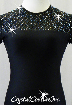 Black lycra leotard with sheer flocked diamond pattern neckline, sleeves and back all embellished with rhinestones!. Costume has a key hole back and includes 2 different skirt options, Black lycra trunks with attached Black back skirt, and Black short high-low skirt.