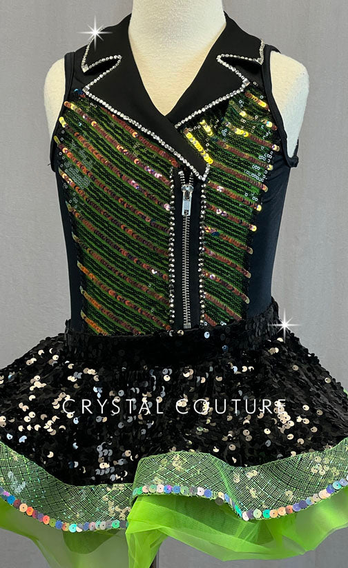 Black & Lime Green Sequin Zipper Vest with Tulle Skirt - Rhinestones