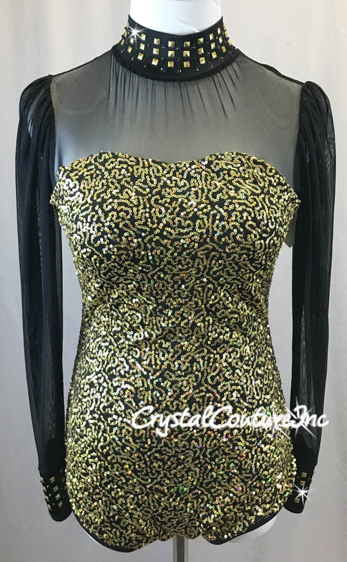Black Long Sleeve Leotard with Gold Zsa-zsa Sequins & Metallic Studs - Swarovski Rhinestones