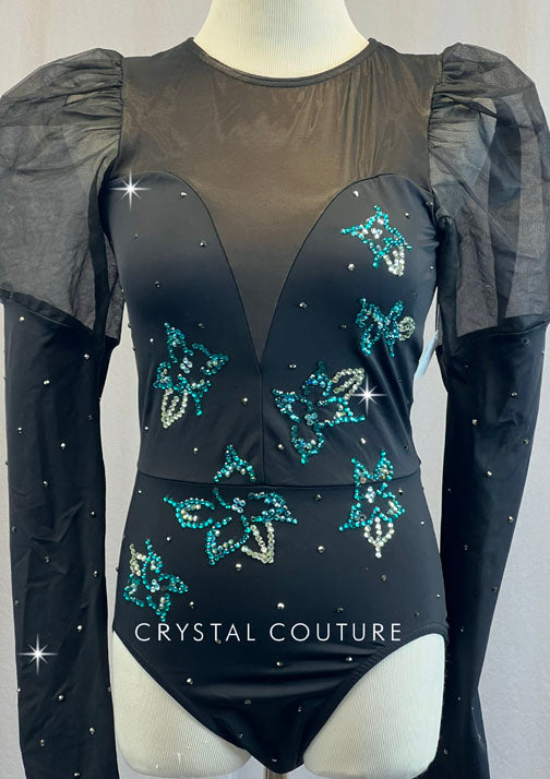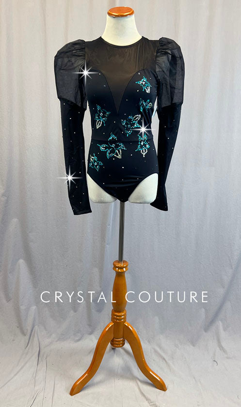 Black Long Sleeve Leotard with Tulle Puffed Shoulders - Rhinestones