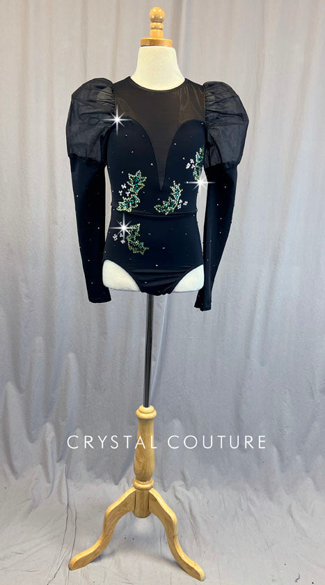 Black long sleeve leotard has sweetheart neckline with mesh on back and upper chest. Sleeves have puffed, stiff tulle shoulders. Back has zipper closure. Floral rhinestoning on front of torso.