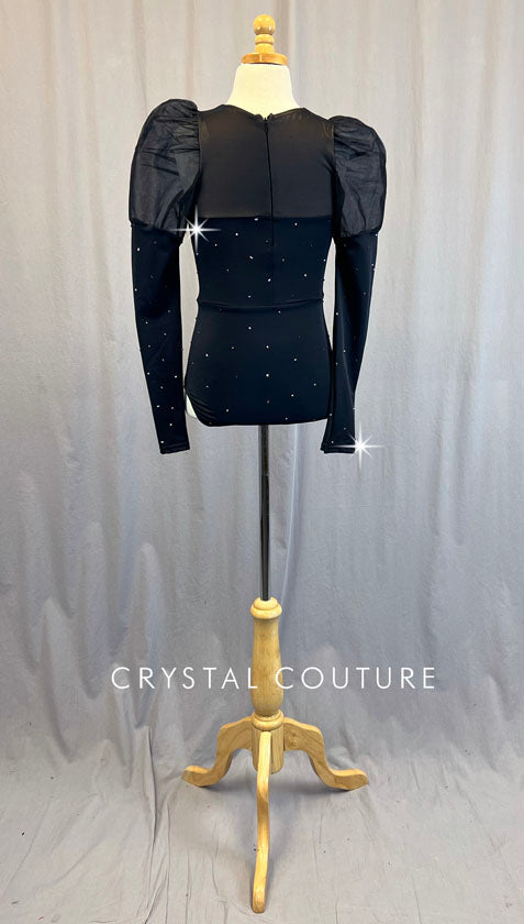 Black Long Sleeve Leotard with Tulle Puffed Shoulders - Rhinestones