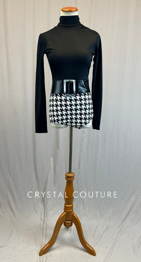 Black Mock Neck Leotard with Houndstooth Trunks and Pleather Belt