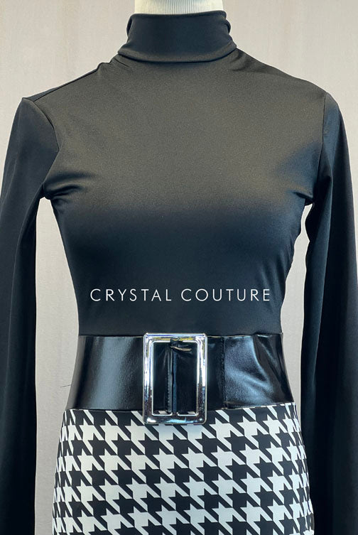 Black mock neck leotard has full length sleeves and keyhole back with X cross straps. Bottom of leotard is Black and White houndstooth. Attached pleather belt with belt buckle.