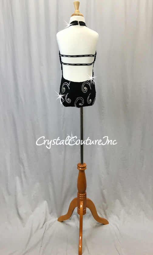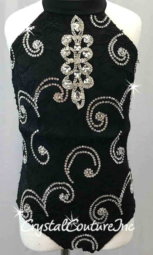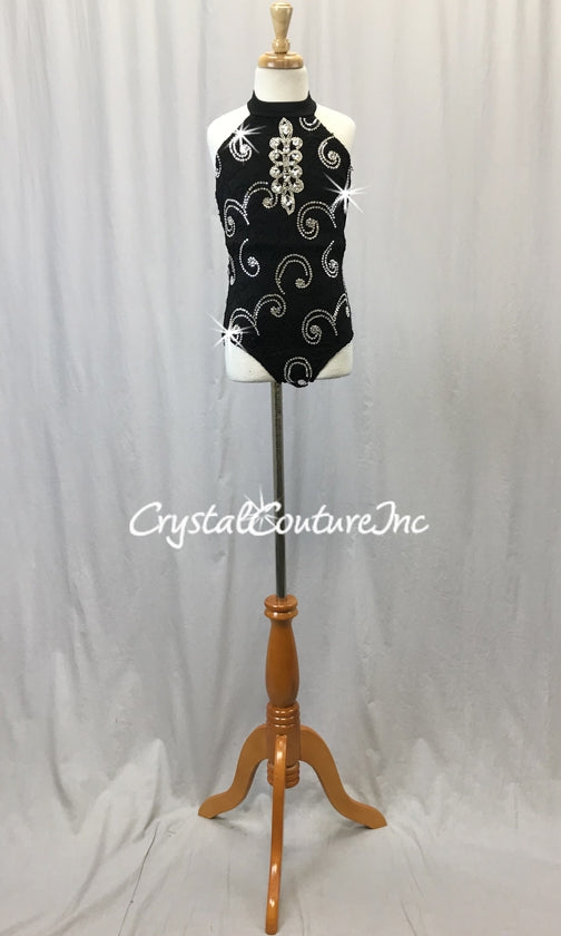 Striking Black custom made open net lace leotard over Black lycra. Halter neck costume has open back with 3 rhinestones straps. Embellished with Crystal rhinestone appliques and Swarovski rhinestones detailing the swirl pattern!