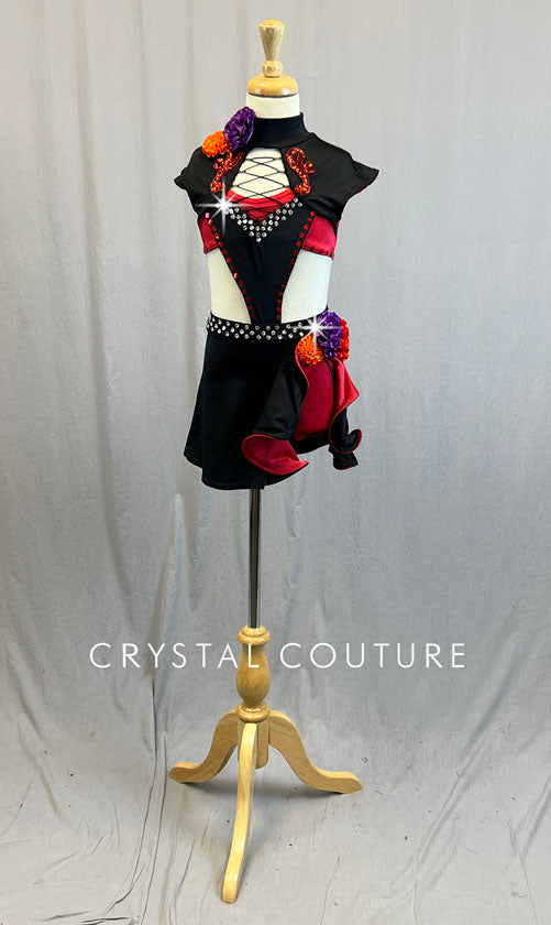 Black and Red bolero style mock neck top has structured cap sleeves and lace up detail on chest. Connected to Red trunks with Black ruffle side slit skirt. Embellished with Orange, Red, and Purple ribbon flowers and sequined appliques. 1 Gross of Crystal 30ss Rhinestones!