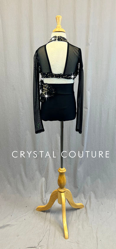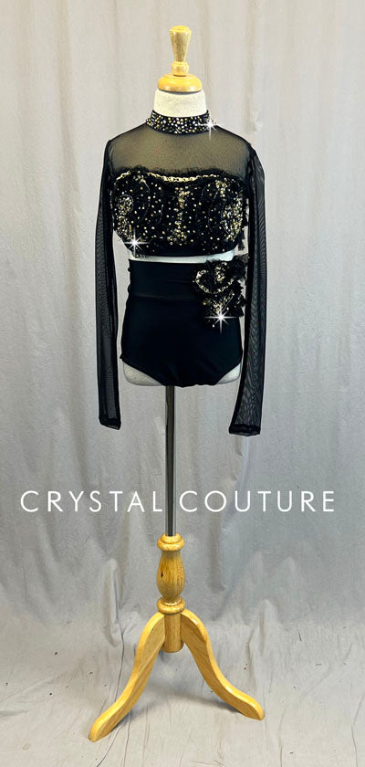 * AMAZING Black custom made 2 piece! Base of the top and trunk is Black lycra with Black sheer mesh neckline and long sleeves. Top is decorated with Black sheer mesh circular ruffles, Gold metallic sequins, Graphite beads and lots of Swarovski rhinestones. The same mesh/sequin/rhinestones design is on the side of the shorts. Additional Gold and Pearl chain accents the costume!