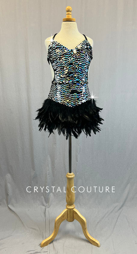 Black & Silver Sequin Dress with Lace Up Back and Feather Skirt
