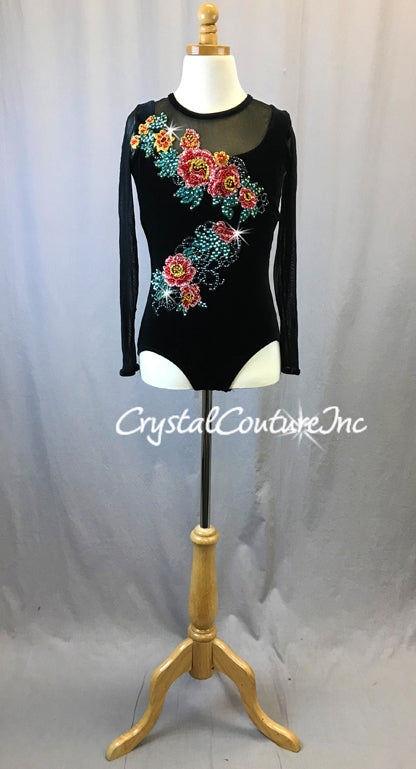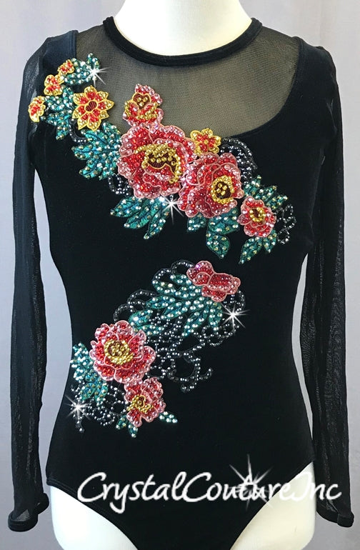 Black velour leotard with Black sheer mesh long sleeves, neckline, and back. Embellished with colorful embroidered floral appliques and Swarovski rhinestones.