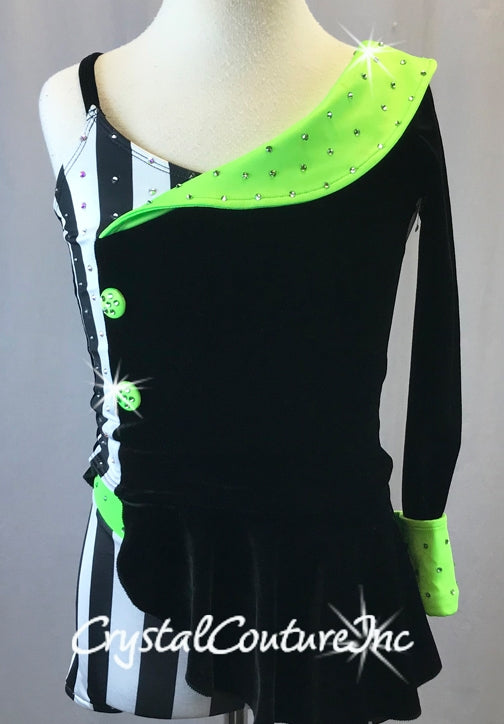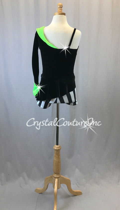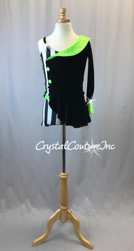 Black Velour, Black/White Stripe with Green One Sleeve Top with Trunks - Swarovski Rhinestones
