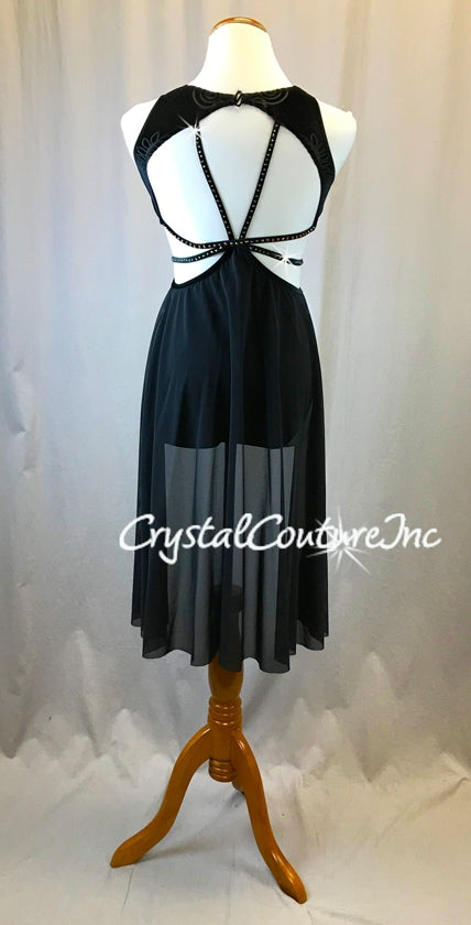 Black velour leotard with Black sheer mesh and velour burnout design on the bodice, lined with Nude. Costume has strappy back with attached Black mesh draped skirt. Embellished with Swarovski rhinestones!