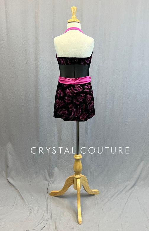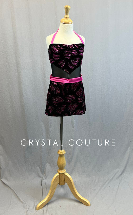 Black velvet halter dress has mesh midriff and attached mini skirt. Pink glitter print on velvet. Strap and waistband and Pink lycra.