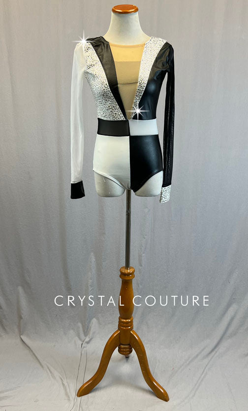 Black & White Color Block Deep V Leotard with Mesh Sleeves - Rhinestones